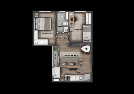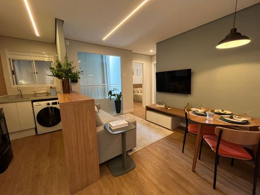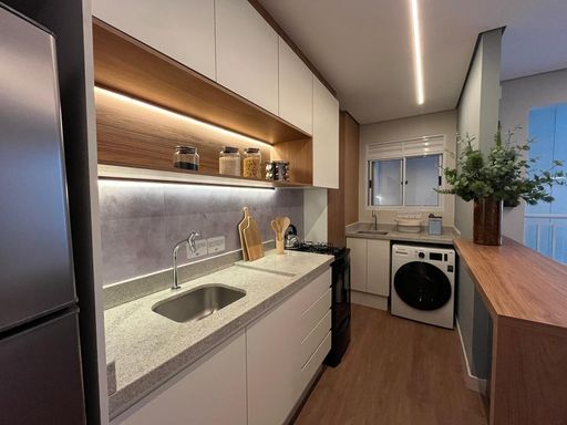 2 dormitorios, sala, cozinha, lavanderia, varanda, 1 banheiro e 1 vaga de garagem, planta de 42,54m2.